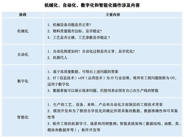 和無人操作(最優化的機器代人)。中國和歐美國家所處的機械化、自動化、數字化和智能化階段目前國內很多較弱的企業仍然在機械化階段,較好的企業則在機械化、自動化和數字化階段。雖然通過數據看板能看出很多問題,但這只是在自動化和數字化領域的“補課”。中國企業數據質量是各家的軟肋。歐美國家的機器代人階段早已完成,生產線主要依賴于自動化而非人工;而且絕大多數歐美國家數字化的需求已經基本上得到滿足。在智能化方面,很多較好的歐美企業有較好的智能系統,稍微差的企業也正在努力嘗試智能系統。目前中國的智能制造主要在制造過程的首尾兩端,比如智能倉儲、來料及成品的運送等等,而對智能制造的主體過程,比如生產過程的優化,涉及的不是很多。歐美國家正在努力推進智能制造。在智能制造中,大量工作都編入智能系統中了,工程師或技術人員主要在后臺持續優化此系統;優化后的系統由現場人員操作以完成生產;同時經理人員注重觀察此系統。這樣大家勁往一處使,生產持續優化。