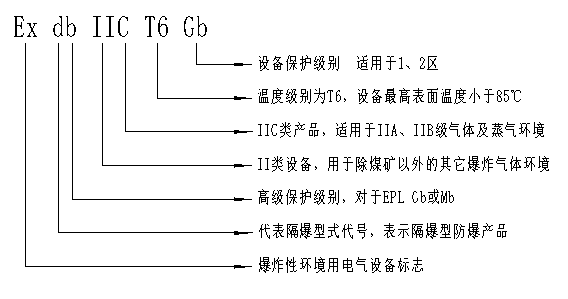 ④ T1T6:電氣設備的最高表面溫度組別符號,共6組,從≧450℃~≧85℃。