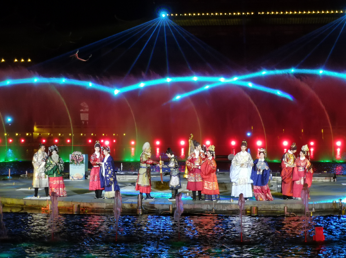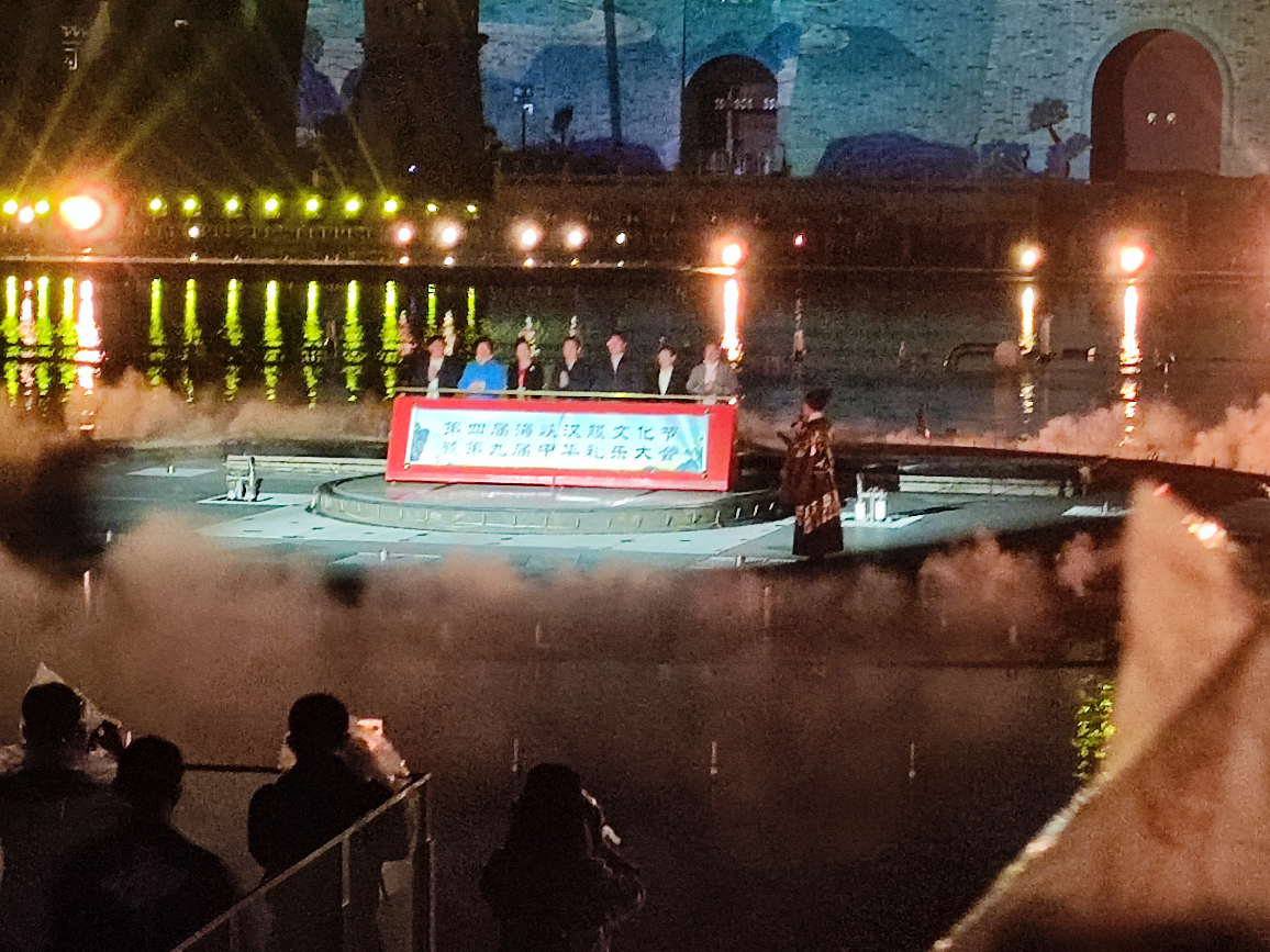9點半,城門如約而至地開啟了。從城門中出來的身著鎧甲的武士和手拿燈籠的美女演員們,為我們上演了一場閩王迎賓的表演。然而由于全國各地紛沓而來圍觀的同袍身高都好高,我這種五短身材只能在夾縫中窺探真章,那時便想著我要是再高點該多好啊。迎賓表演后,便是按照前幾屆的慣例,依序按照社團次序,莊嚴入城。從城門走過之后便跟著前方的隊伍走到廣場對面的座椅上一起來了張大合照,合照結束的我們便跟著大隊伍來到了福船廣場。